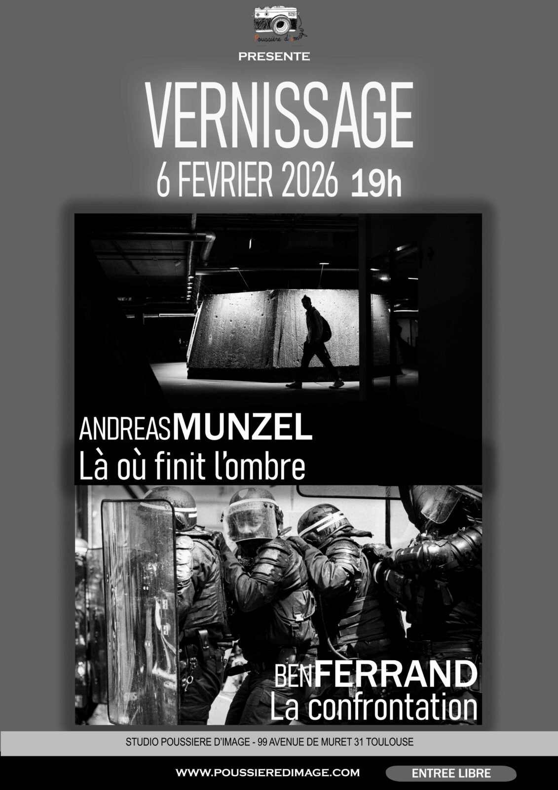 VERNISSAGE le 6 février 2026 : Ouvert à tous, gratuitement. En ce mois de Février 2026, nous poursuivons notre programmation éclectique avec non pas UN mais DEUX expositions de STREET PHOTO aussi différentes que complémentaires ! Andreas MUNZEL, photographe « poussiéreux » et animateur de street photo nous invite à le suivre LA OU FINIT L’OMBRE. Il nous propose une expérience immersive qui mêle photographie, mots et musique, où chaque élément accompagne l’autre sans le dominer. Des codes SPOTIFY nous ouvrirons ces autres dimensions ! « J’ai longtemps cherché la lumière, mais avec le temps, j’ai réalisé que ce qui m’attirait vraiment, c’étaient les intervalles, les… Lire la suite : Vernissage Andreas MUNZEL et Ben FERRAND