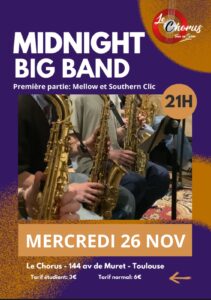 Le Midnight Big Band, formation de 16 musiciens survoltés, enflammera la scène avec des arrangements irrésistibles mêlant jazz, funk et fusion.