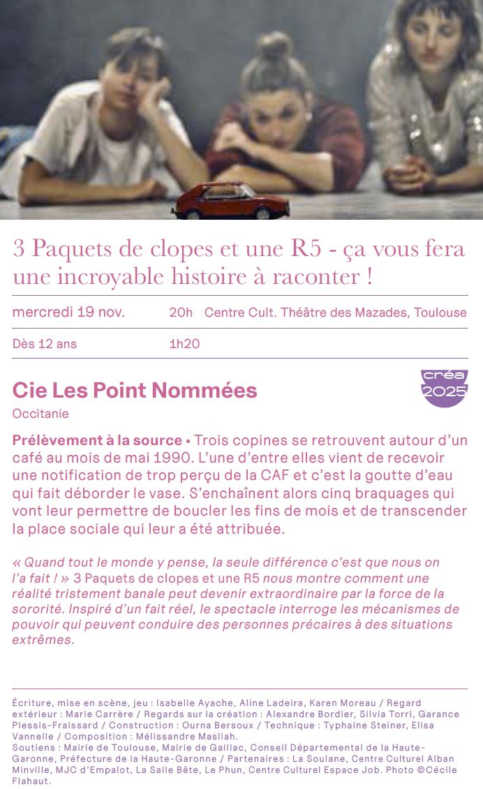 - 20h30 : “3 paquets de clopes et une R5” (durée 1h20), au théâtre des Mazades (centre culturel des Mazades, 10, avenue des Mazades, Toulouse) COMPLET