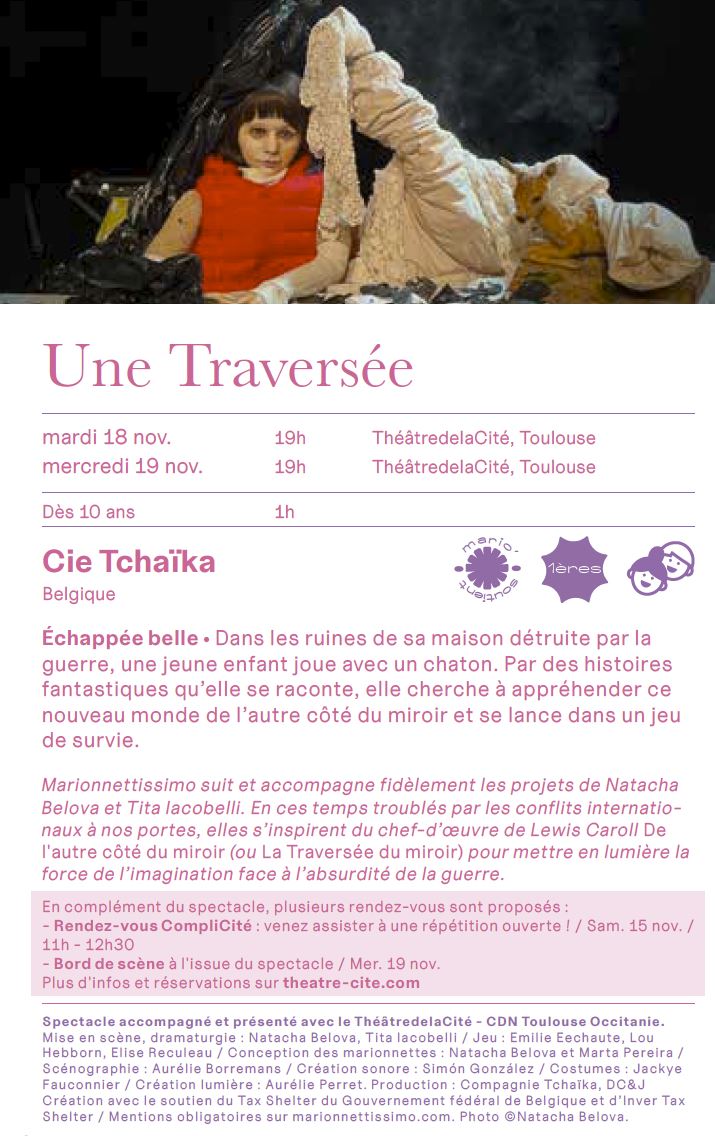 - 19h : “Une traversée” (durée 1h) , au théâtre de la Cité (1, rue Pierre Baudis, Toulouse) COMPLET